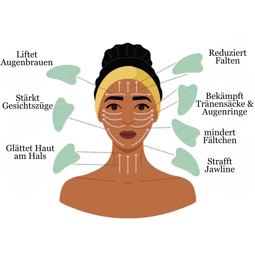 Gesichtsyoga stĂ€rkt die Gesichtsmuskulatur, wodurch die Haut straffer wirkt und der natĂŒrliche Alterungsprozess verlangsamt werden kann. In Kombination mit Gua Sha regst du zudem die Durchblutung an, was Schwellungen reduziert und der Haut ein strahlendes Aussehen verleiht. Die Massage hilft auĂerdem dabei, Spannungen zu lösen und fördert die Lymphdrainage, was zu einem frischen Teint fĂŒhrt.