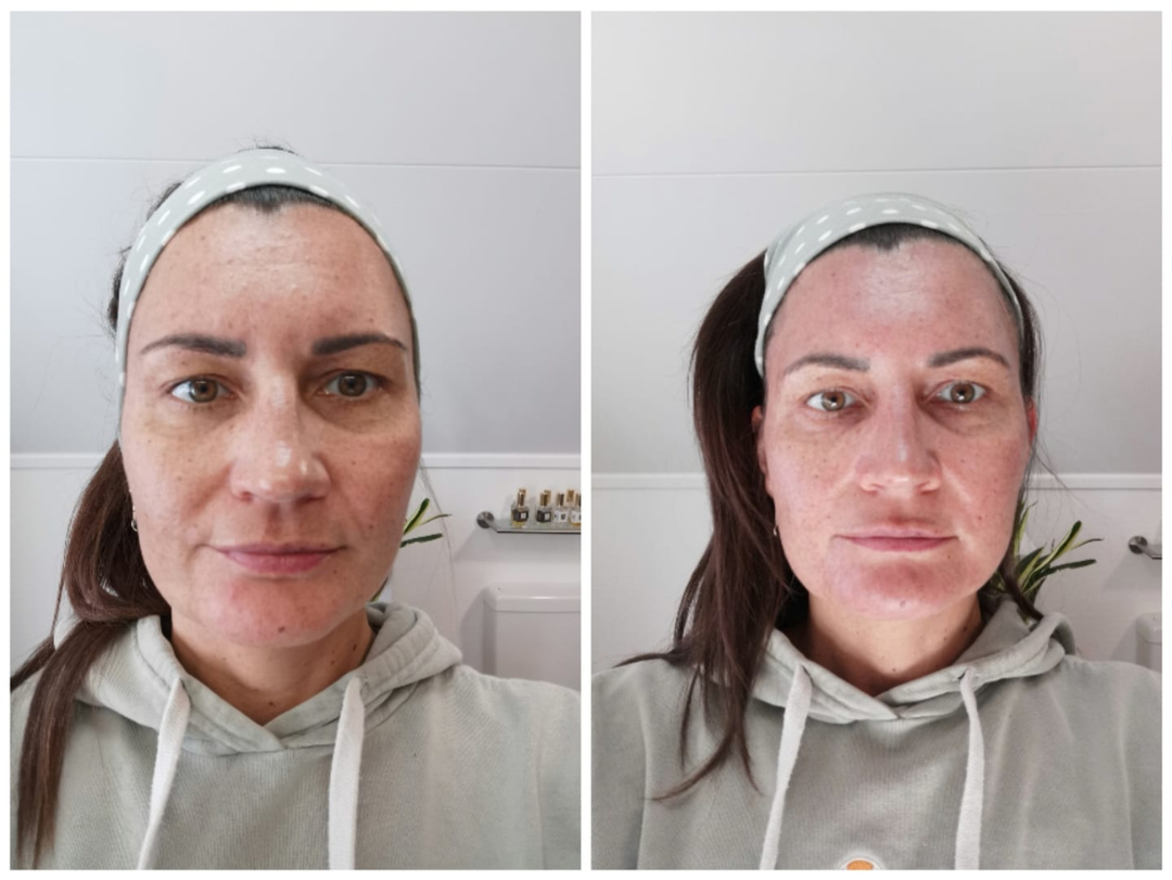 • "Nach der ersten Anwendung (75min Einwirkzeit) wirkt meine Haut deutlich rosiger und frischer. Nasenlabialfalte ist auch deutlich reduziert, und das auch noch am Folgetag! Ich bin überrascht und sehr zufrieden."