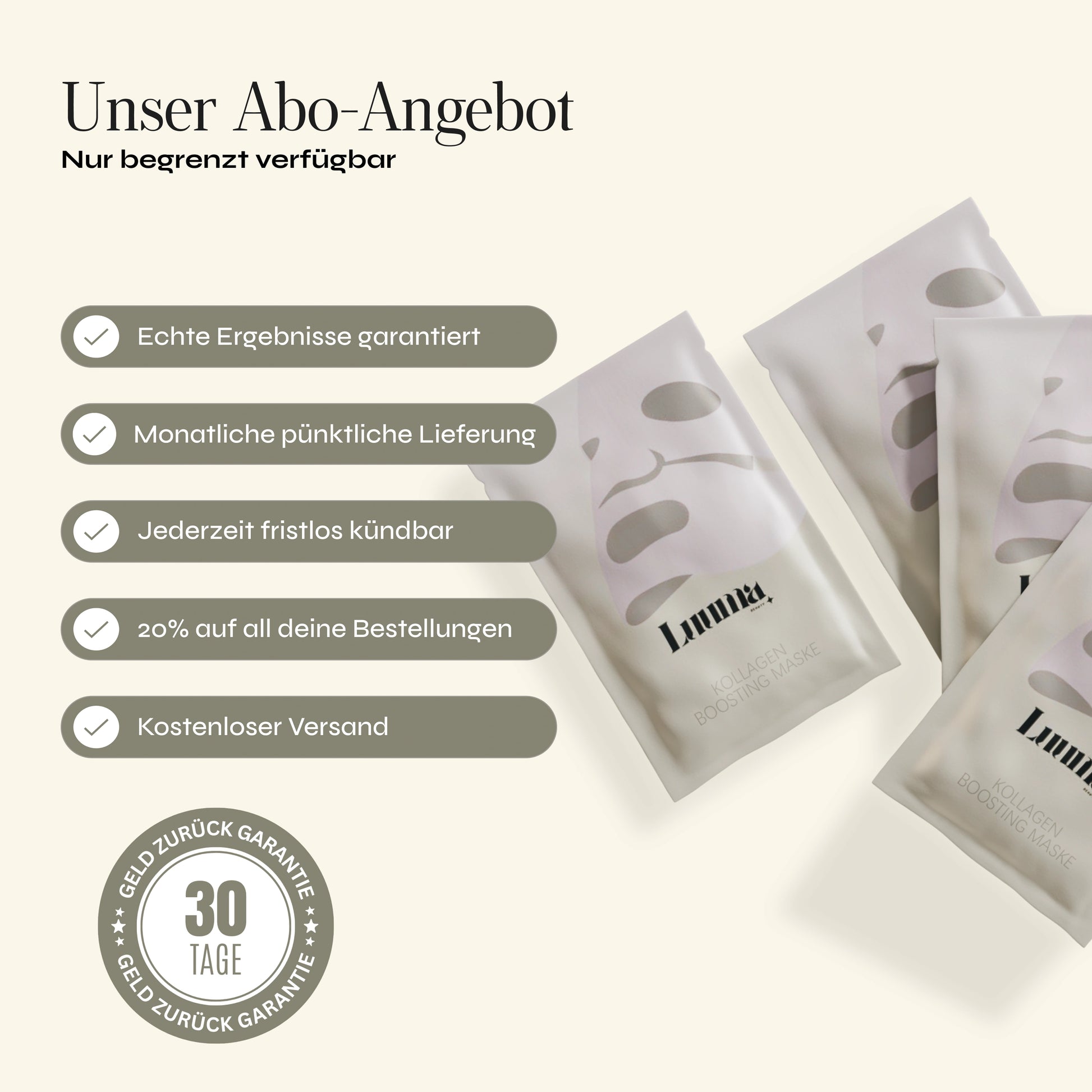 4 Kollagen Boosting Masken. Wir empfehlen die Anwendung zweimal pro Woche für beste Ergebnisse