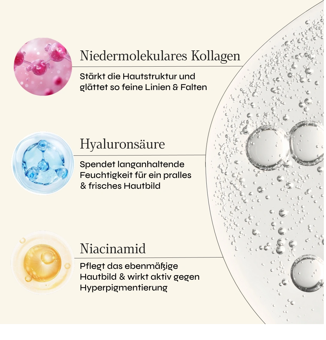 Hyaluronsäure spendet intensiv Feuchtigkeit, polstert die Haut auf und verleiht ihr ein frisches, glattes Aussehen.