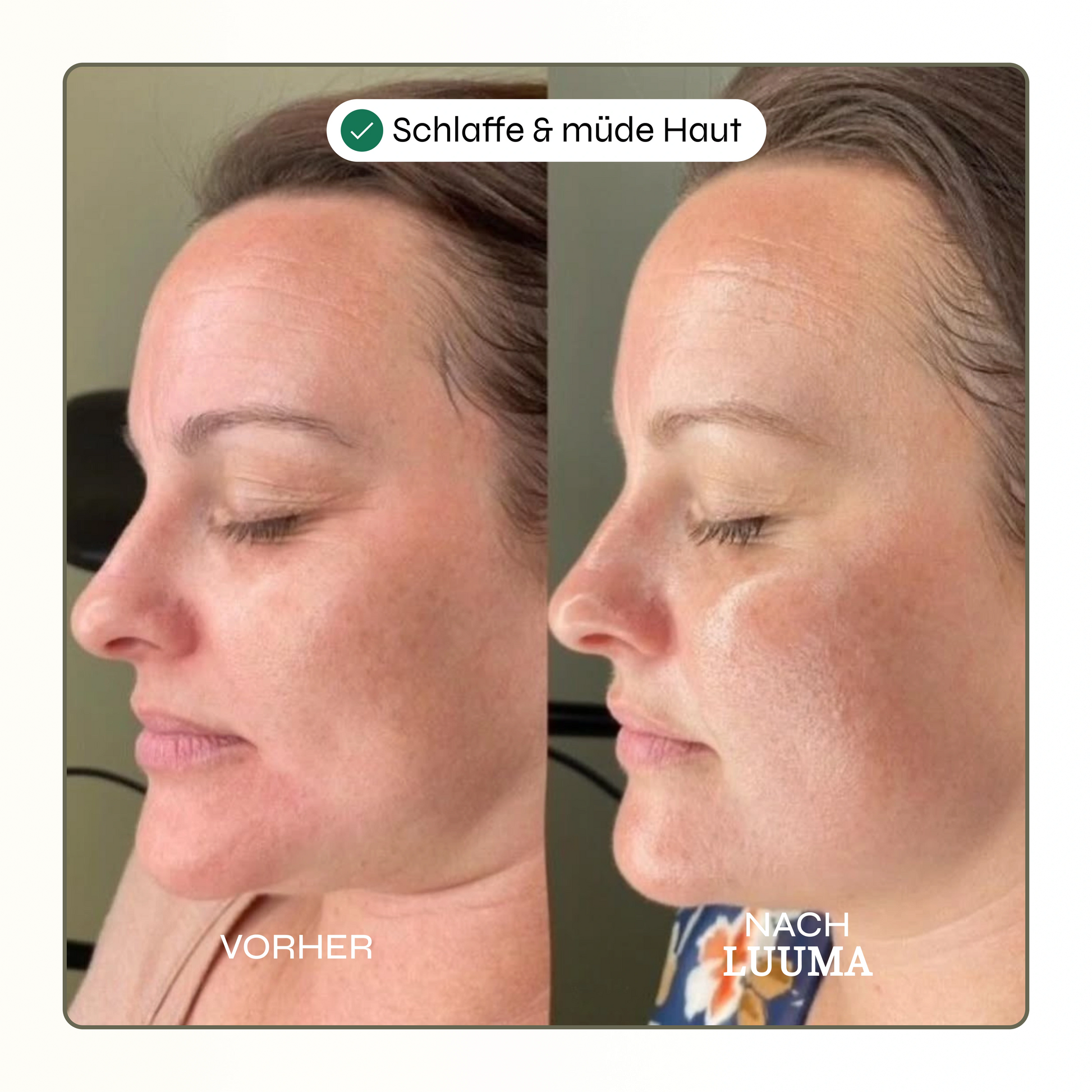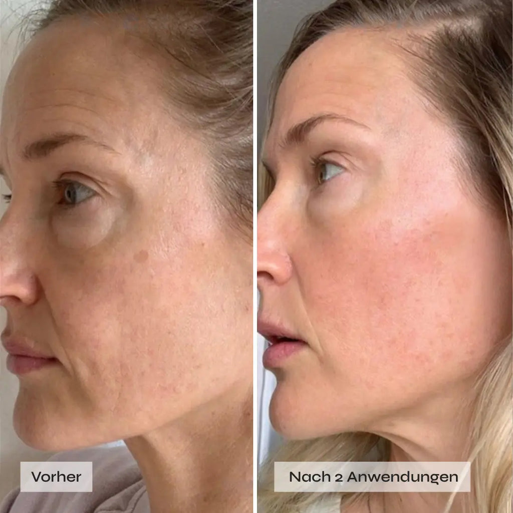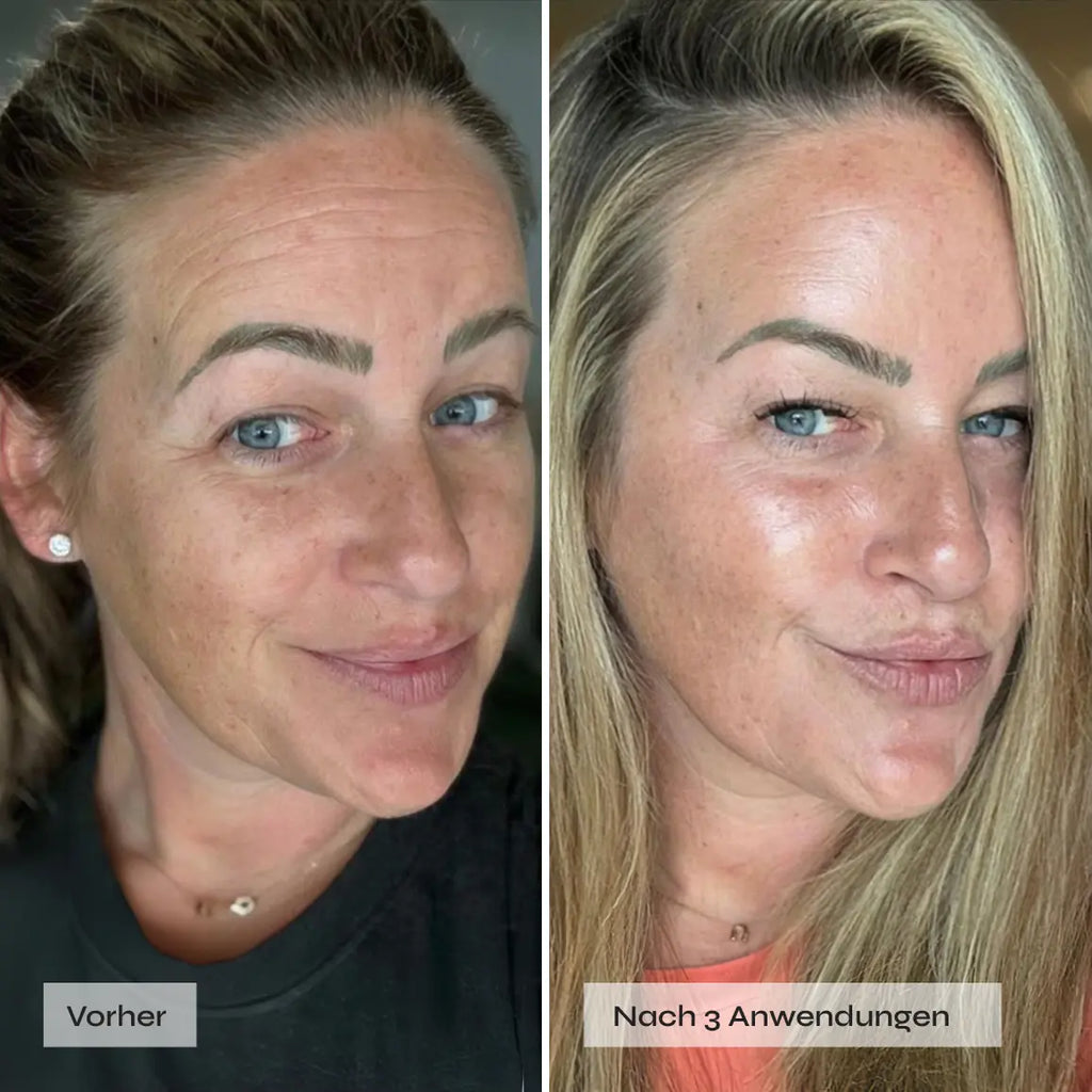 Langfristig: Nach 3-4 Wochen bei 1-2x wöchentlicher Anwendung – straffere Haut, weniger tiefe Falten, dauerhafter Glow.
