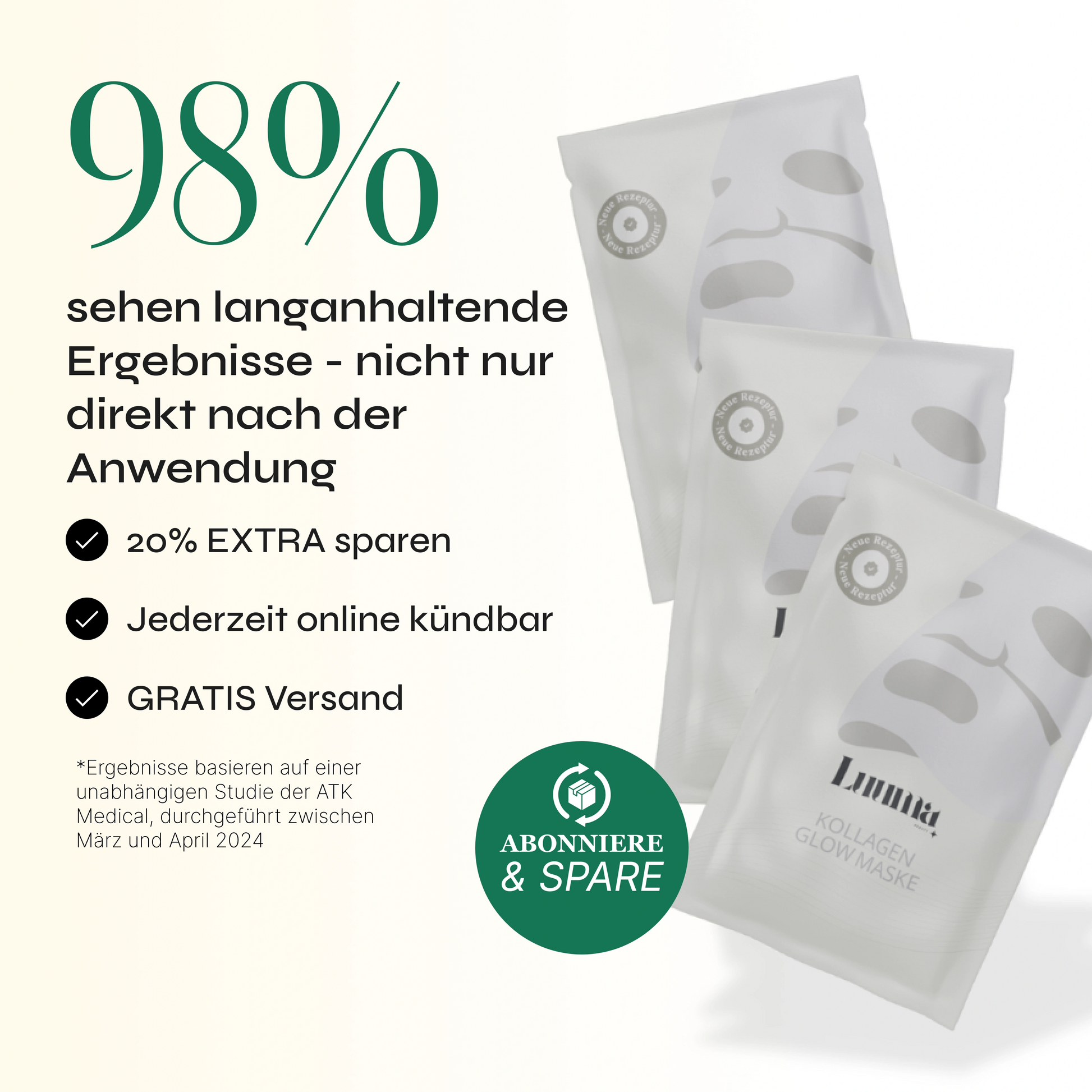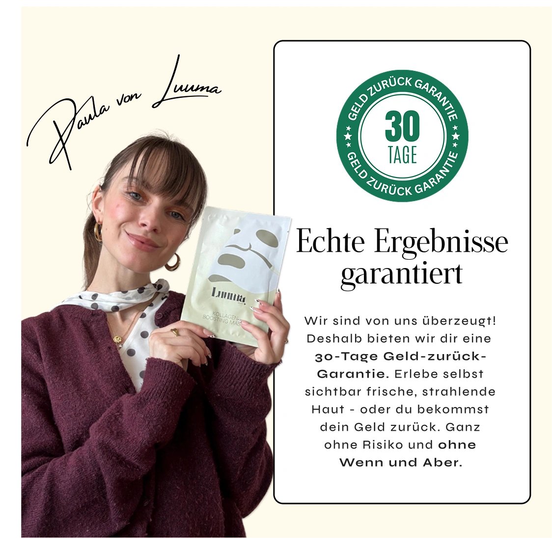 Basierend auf einer unabhängigen Befragung von 1.320 Kundinnen, die Luumas Kollagen Glow Maske einen Monat lang wöchentlich benutzt haben. Ergebnisse können variieren.